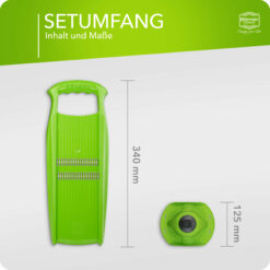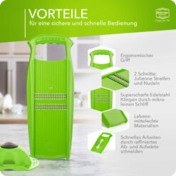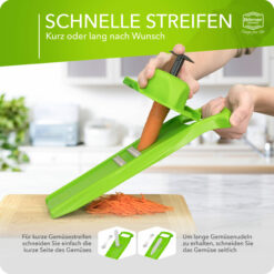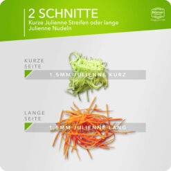 The Borner Roko PowerLine Julienne Slicer enables you to cut fruit and vegetables into fine, uniform “Julienne strips”. The Roko Slicer cuts carrots, celery, turnips, cabbage, parsnips, and more. Hard cheese or even chocolate emerge in beautiful strips. You can process large quantities in a very short time due to the rows of blades polished on both sides. To clean, simply hold briefly under running water.