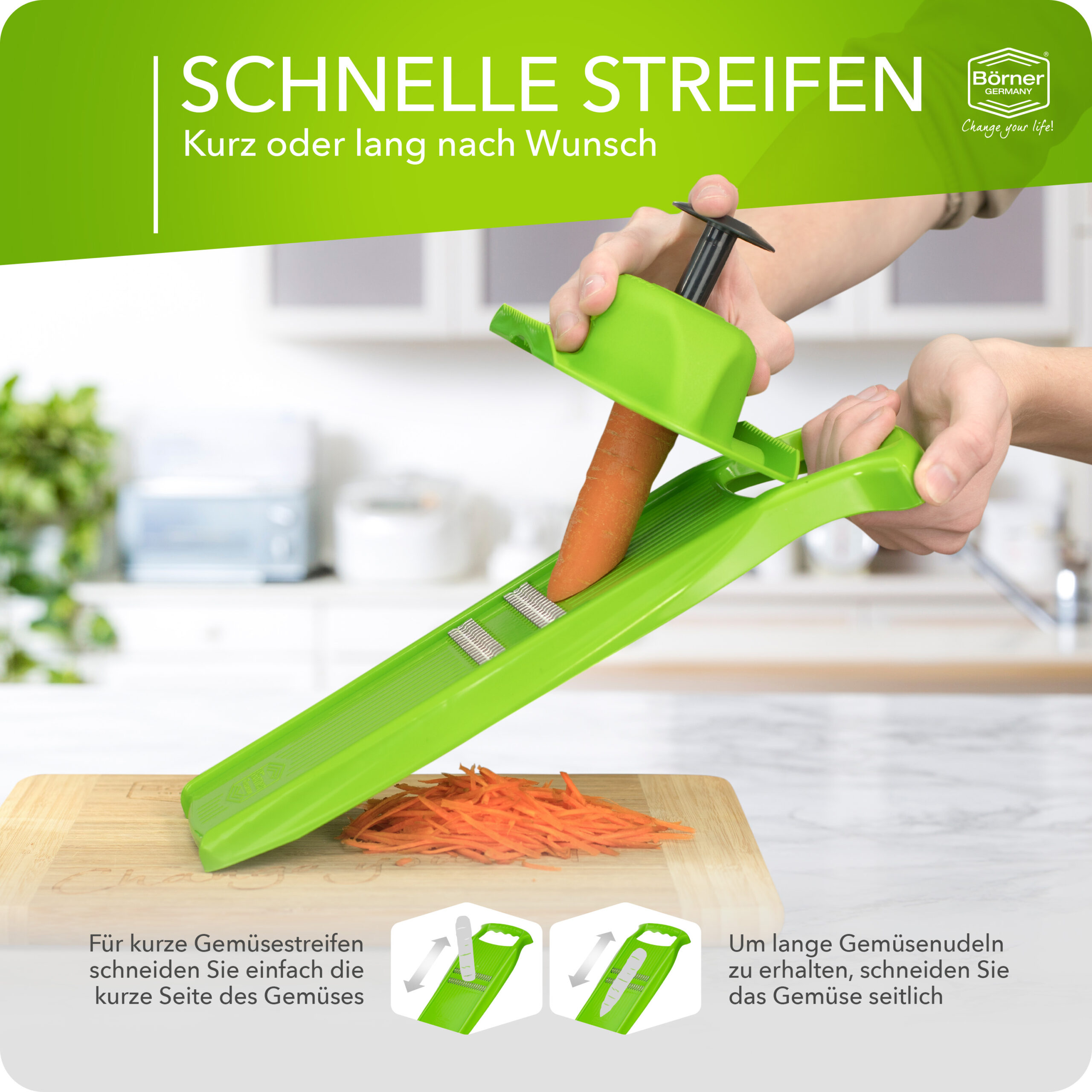 The Borner Roko PowerLine Julienne Slicer enables you to cut fruit and vegetables into fine, uniform “Julienne strips”. The Roko Slicer cuts carrots, celery, turnips, cabbage, parsnips, and more. Hard cheese or even chocolate emerge in beautiful strips. You can process large quantities in a very short time due to the rows of blades polished on both sides. To clean, simply hold briefly under running water.