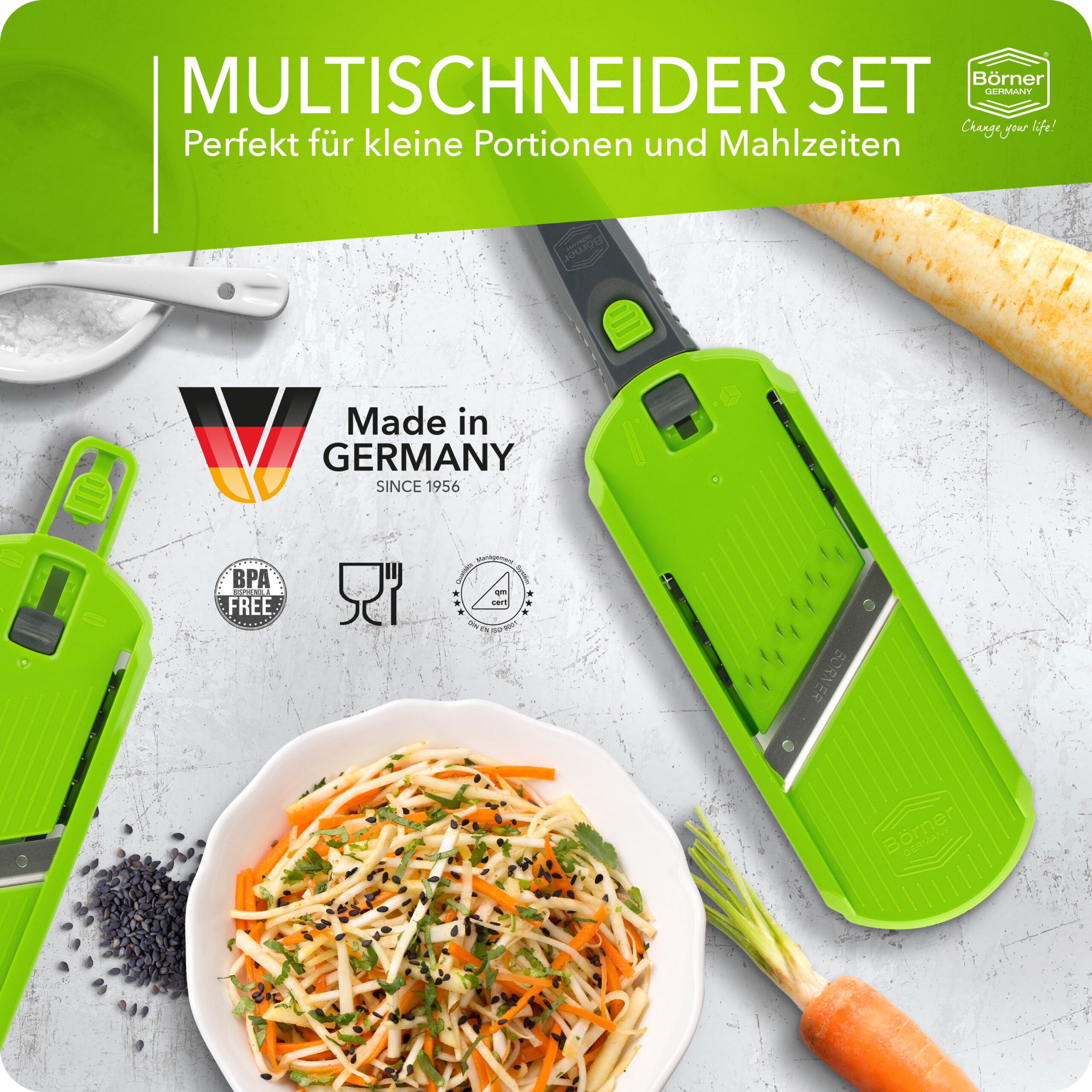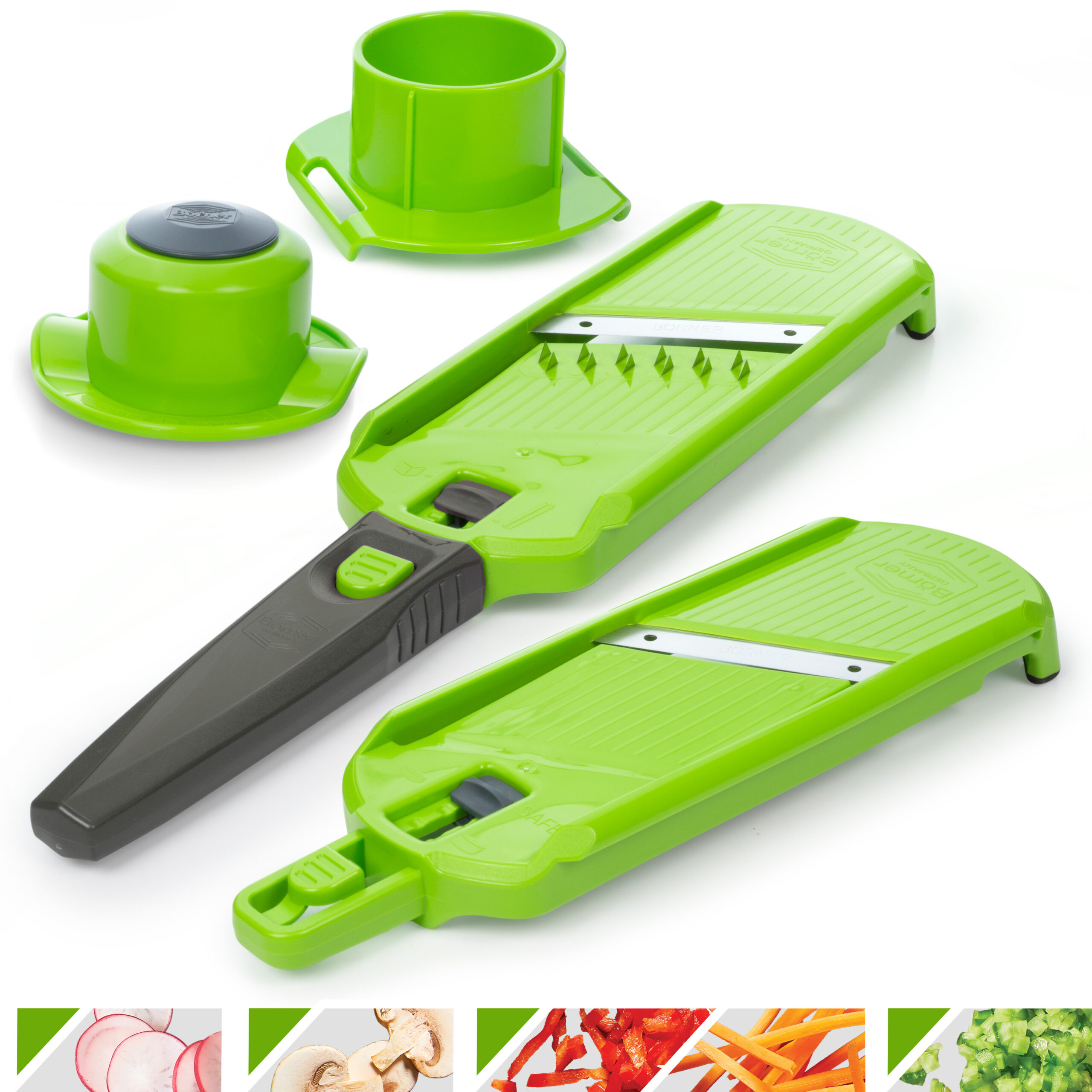 - Multi Slicer, mit dem Sie einfach und präzise Gemüse- und Obst in Scheiben schneiden können. Mithilfe des Buttons können Sie in 2 verschieden Stufen schneiden, durch eine weitere Stufe haben Sie sogar eine Sicherheitsfunktion, die vor den scharfen Messern schützt.