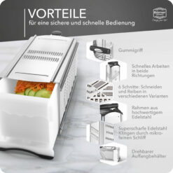 Im Handumdrehen bereiten Sie gesunde und schnelle Gerichte aus leckerem Obst und Gemüse zu. Durch das 2-Wege Schneiden wird das Schneiden deutlich erleichtert. Vier Seiten ermöglichen auch vier verschiedene Schnittarten. So können Sie Scheiben, Julienne-Streifen, grobe und feine Raspel, wie etwa für Rösti oder auch Käse schneiden und das mit nur einem Produkt. Zudem enthalten ist ein praktischer innenliegender Auffangbehälter, der das Schnittgut auffängt. So wird es ermöglicht, dass nichts daneben geht und Ihre Küche sauber bleibt. Wir empfehlen Ihnen zudem die Verwendung des Sicherheitsfruchthalters, um auch Ihre Finger vor den scharfen Klingen der Vierkantreibe zu schützen.