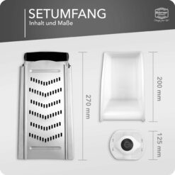 - Lieferumfang: Reibe aus Edelstahl, Auffangschale, Fruchthalter