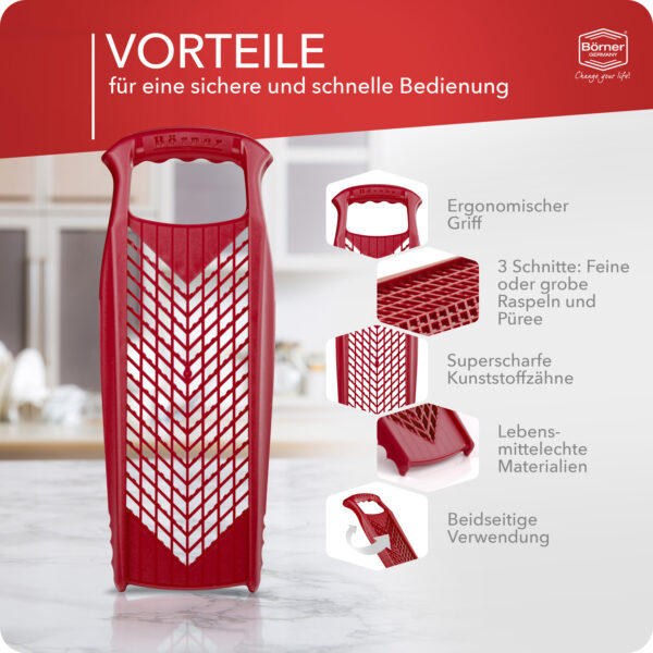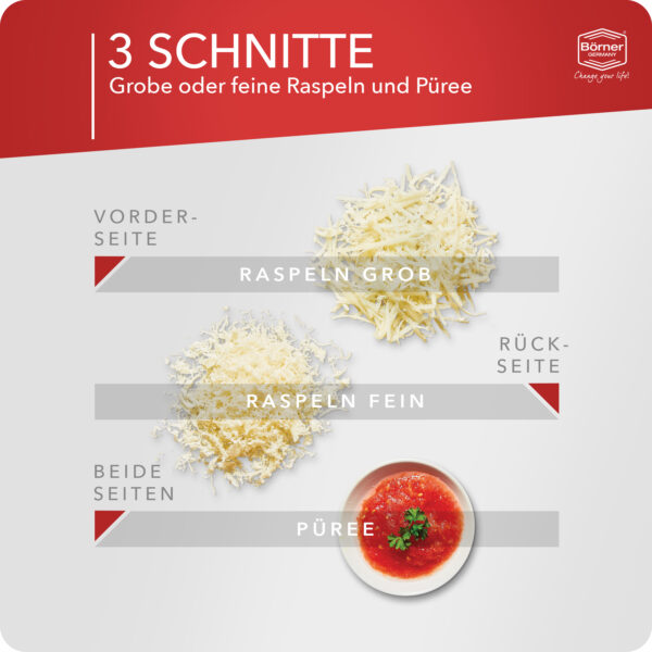 Die original Börner Küchenreibe PowerLine ist beidseitig verwendbar und reibt fein und grob. Reiben Sie Obst, Gemüse, Käse, Schokolade, Schalen von Zitrusfrüchten, Rohkost wie Karotten, Rettich oder Äpfel und vieles mehr. Die Käsereibe PowerLine ist ein praktischer Helfer beim Zubereiten von bekömmlichen Speisen. Die Reibe ist vor allem zum Reiben von hartem Gemüse und Hartkäse geeignet. Weichere Käsesorten sollten Sie vor dem Reiben einige Zeit im Kühlschrank aufbewahren.