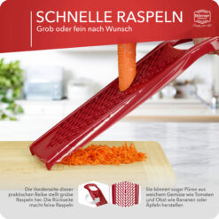 Die original Börner Küchenreibe PowerLine ist beidseitig verwendbar und reibt fein und grob. Reiben Sie Obst, Gemüse, Käse, Schokolade, Schalen von Zitrusfrüchten, Rohkost wie Karotten, Rettich oder Äpfel und vieles mehr. Die Käsereibe PowerLine ist ein praktischer Helfer beim Zubereiten von bekömmlichen Speisen. Die Reibe ist vor allem zum Reiben von hartem Gemüse und Hartkäse geeignet. Weichere Käsesorten sollten Sie vor dem Reiben einige Zeit im Kühlschrank aufbewahren.