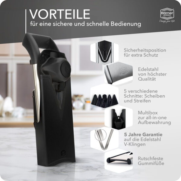 Das Set besteht aus dem Edelstahlrahmen, einem Scheibeneinschub, dem 3,5 mm Messereinschub und 7 mm Messereinschub und dem Sicherheitseinschub, der einerseits als Klingenschutz und andererseits beim Wenden als Einschub für mittlere Scheibenstärken dient. Zum Lieferumfang gehört auch die transparente Multibox, in welcher alle Teile des V6 Edelstahl Gemüseschneiders platzsparend und dekorativ aufbewahrt werden können.
