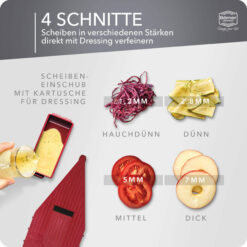 Die Handhabung der Multireibe ist aufgrund der Stufenverstellung der Scheibendicken extrem einfach. Zum Hinzufügen des Dressings, einfach das Dressing in die dafür vorgesehene Kartusche füllen, schließen und loshobeln! Bereiten Sie zum Beispiel mit der Multireibe leckeren Gurkensalat zu oder köstliches Carpaccio aus Tomaten oder Rote Beete.